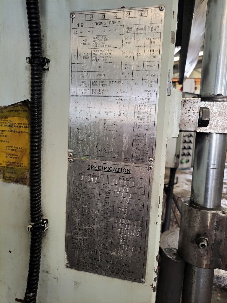 仕様 (EN) - 熱間鍛造プレス Jaewoo JFP-2000 - 2000 トン (ID: 76358)